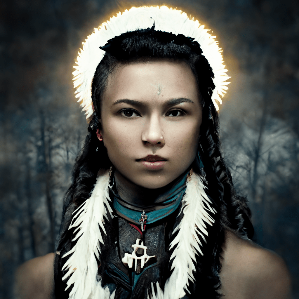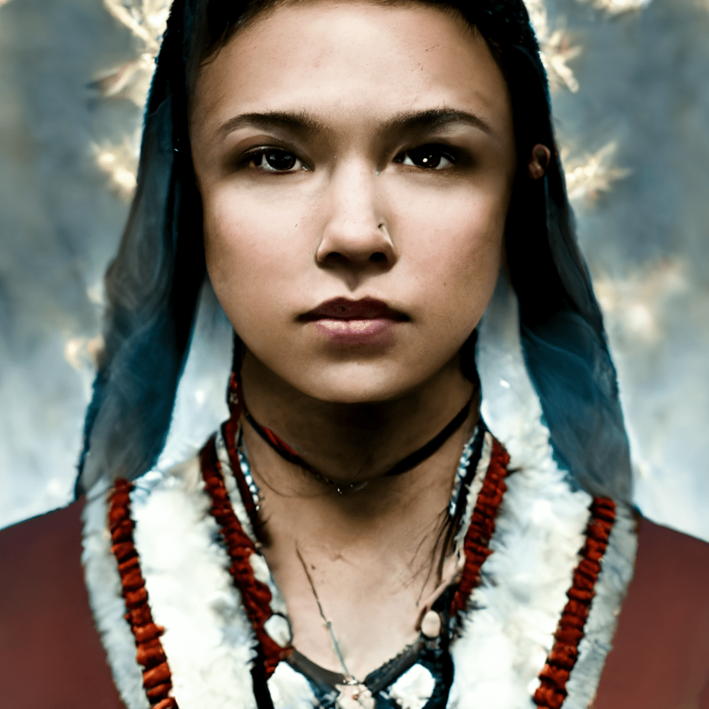 A method I use to keep consistency in the facial features of my images is to ask the AI to mix two or three faces every time, which it does surprisingly well. When I was trying to create an image for St. Kateri, I typed in that I wanted the person to look like a mix of specifically two famous Native American women: Crystle Lightning and Alex Rice. This threw up varied portraits, but in every portrait, the woman looked largely the same.